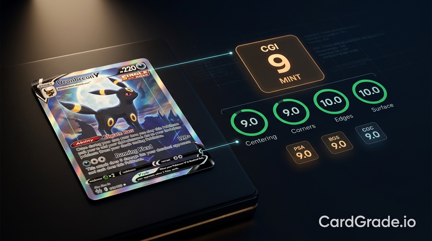CardGrade.io's CGI Vision AI system evaluates cards through four analysis categories: centering telemetry with sub-millimeter border measurement, surface detection for scratches and print defects, edge and corner wear analysis, and confidence scoring that provides a variance estimate with each prediction. The platform reports a plus-or-minus 0.22 grade variance across its prediction history.